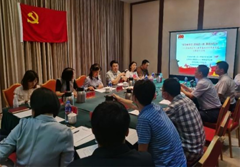 參觀后,4 個(gè)黨支部齊聚會(huì)議室,由濱海新區(qū)區(qū)委組織部高層次人才服務(wù)室黨支部書記劉建輝主持召開了座談會(huì)。宏亞公司黨支部書記岳琳領(lǐng)學(xué)了習(xí)近平總書記關(guān)于加強(qiáng)職業(yè)教育的重要指示批示精神,介紹了全國(guó)先進(jìn)地區(qū)職業(yè)教育考察情況及項(xiàng)目進(jìn)展情況。濱建投項(xiàng)管公司黨支部書記楊程交流了濱海新區(qū)黃港生態(tài)區(qū)職業(yè)教育產(chǎn)業(yè)園入園院校進(jìn)展情況,劉建輝介紹了濱海新區(qū)職業(yè)教育基地建設(shè)展望。在交流研討中,宏亞公司咨詢?nèi)坎块L(zhǎng)高淑玲回答了大家比較關(guān)心的入園院校數(shù)量、政府政策支撐、資金平衡方式等方面的情況。