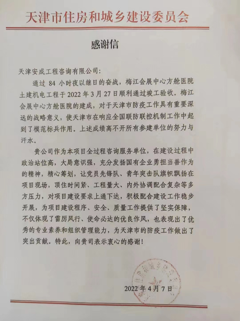 經(jīng)過84小時夜以繼日的奮戰(zhàn),梅江會展中心土建機電工程于2022年3月27日順利通過竣工驗收。4月7日,天津市住房和城鄉(xiāng)建設(shè)委員會向安成公司發(fā)來感謝信,對安成公司在項目建設(shè)過程中體現(xiàn)出的雷厲風行、使命必達的優(yōu)良作風以及優(yōu)秀的專業(yè)素養(yǎng)和組織管理能力給予了高度認可。